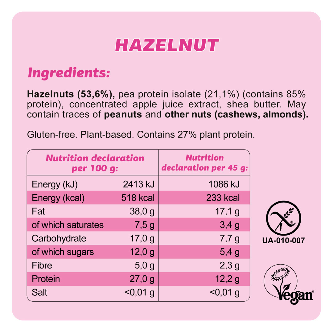 De hazelnoot moet ik nog steeds bij de eerste hap erg aan wennen de allereerste keer dacht ik, wtf is dit. Heel zanderig, maar bij de 2e hap werd dit al minder. En een groot voordeel dat er heel weinig ingrediënten inzitten en geen suiker! Al met al zou ik m zeker nog een keer bestellen, makkelijk in je tas met een dagje weg