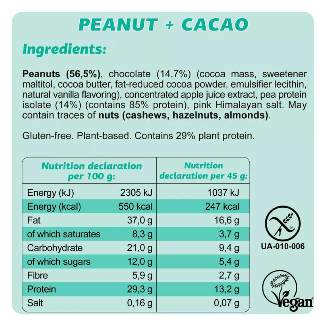 - Peanut/Cacao: Hartige pinda’s gecombineerd met de volle smaak van cacao.